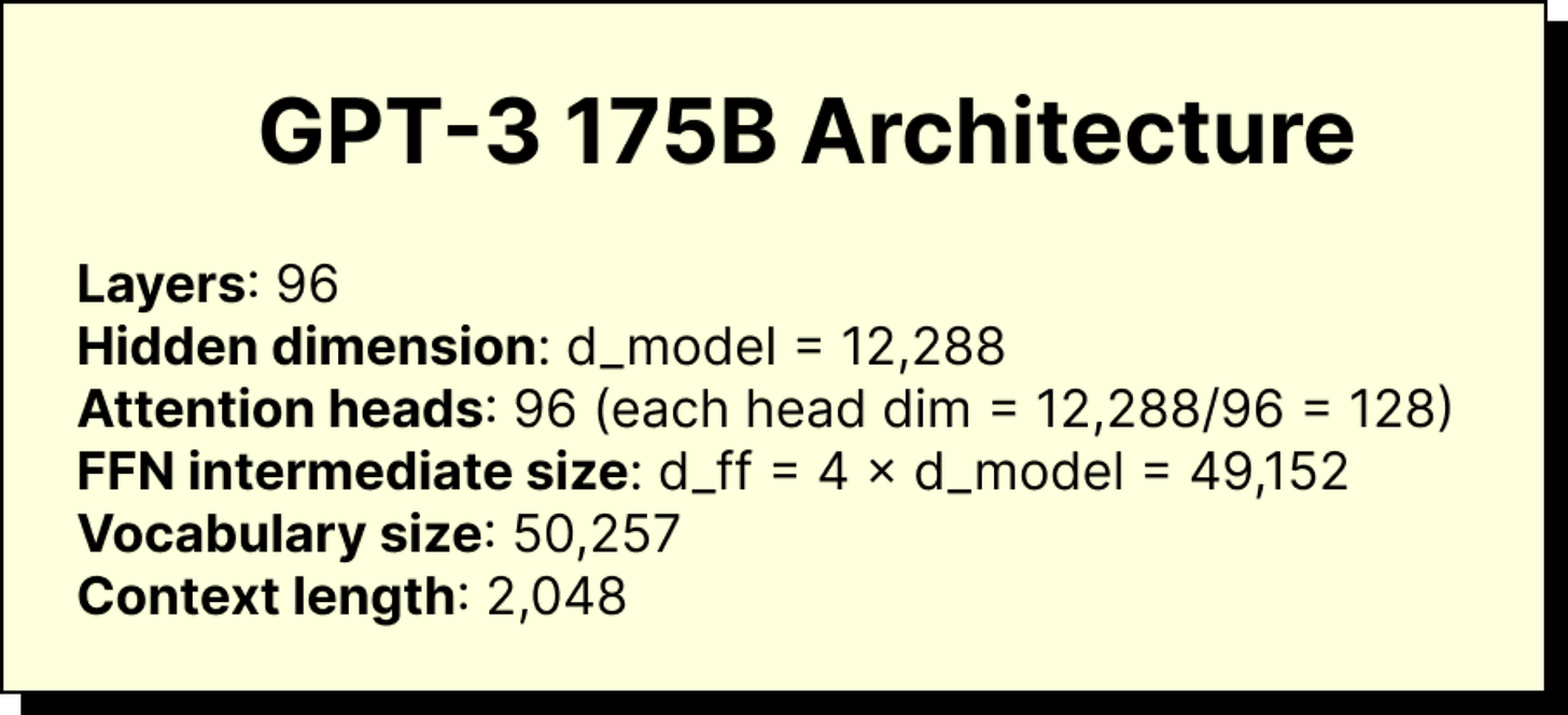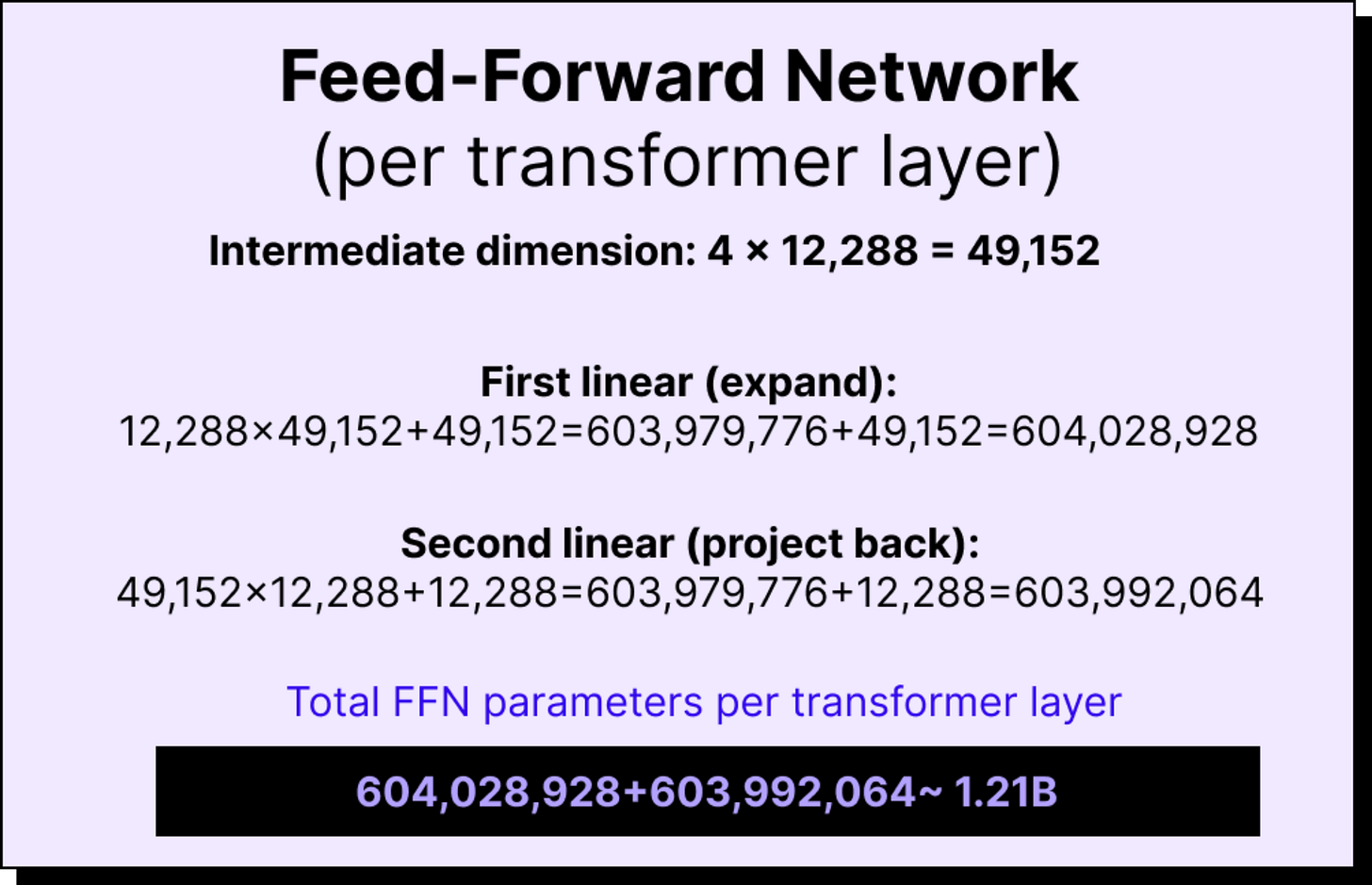 This simple observation changes how one should think about model design and optimization. Each Transformer block in GPT-3 is repeated 96 times, and in every block the MLP section is the largest in terms of parameter count. While attention helps in capturing dependencies and context, the feedforward network actually contains the dense weight matrices that dominate memory and computation. This is why most of the model’s size and training cost lie in those MLP layers, not in the attention mechanism itself.