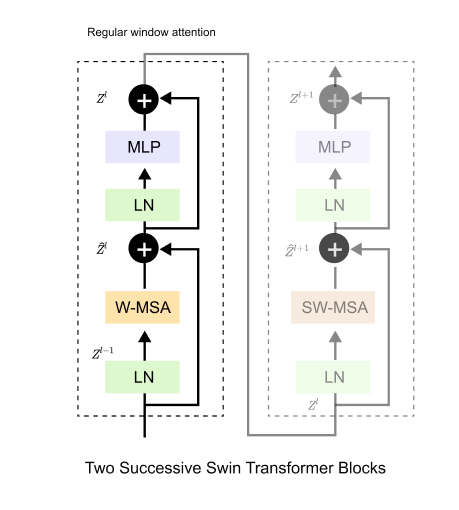 The fundamental computational unit of the architecture is the Swin Transformer block, expanded on the right side of Figure 1.6. A single Swin Transformer block is composed of two consecutive transformer style sub blocks. The first applies window based multi head self attention, where attention is computed independently within non overlapping local windows. The second applies shifted window based multi head self attention, which uses a spatially shifted window configuration to enable information exchange across neighboring windows. Each attention module is wrapped with layer normalization, residual connections, and a feed forward multilayer perceptron, closely mirroring the standard transformer design. While these components are individually familiar, their specific arrangement and interaction through windowing and shifting form the core novelty of the Swin architecture.