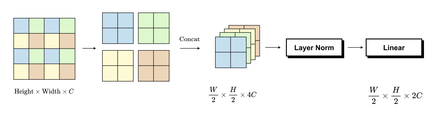 The core operation in patch merging is the grouping of four neighboring patches arranged in a 2 × 2 grid. Consider four adjacent patch tokens, each of dimensionality C. These four tokens are concatenated along the channel dimension, producing a single token of dimensionality 4C. This operation reduces the spatial resolution by a factor of two along both height and width, since each 2 × 2 group of patches is replaced by a single patch token.