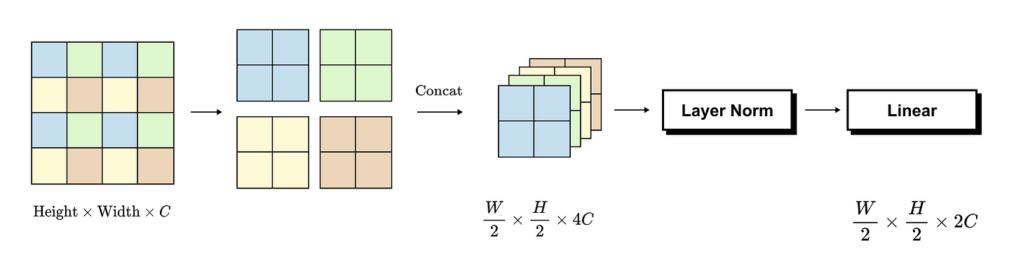 Four neighboring patch tokens are concatenated along the channel dimension to form a 4C-dimensional representation, followed by a linear projection to 2C, reducing spatial resolution while increasing feature abstraction across stages.