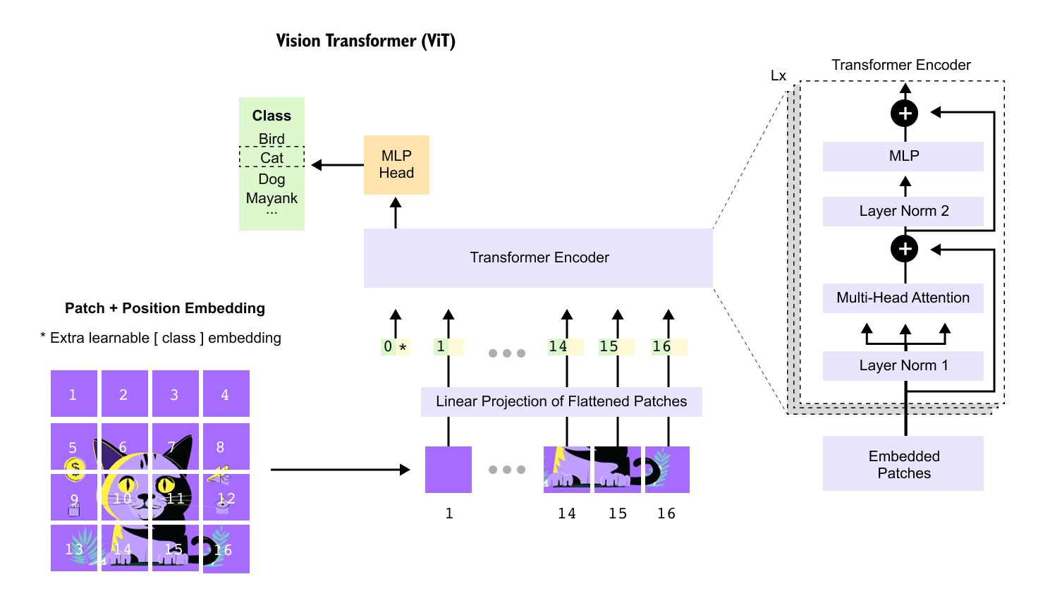 An input image is divided into fixed size patches, flattened, linearly projected, and combined with positional embeddings to form a sequence of tokens processed by a standard transformer encoder.