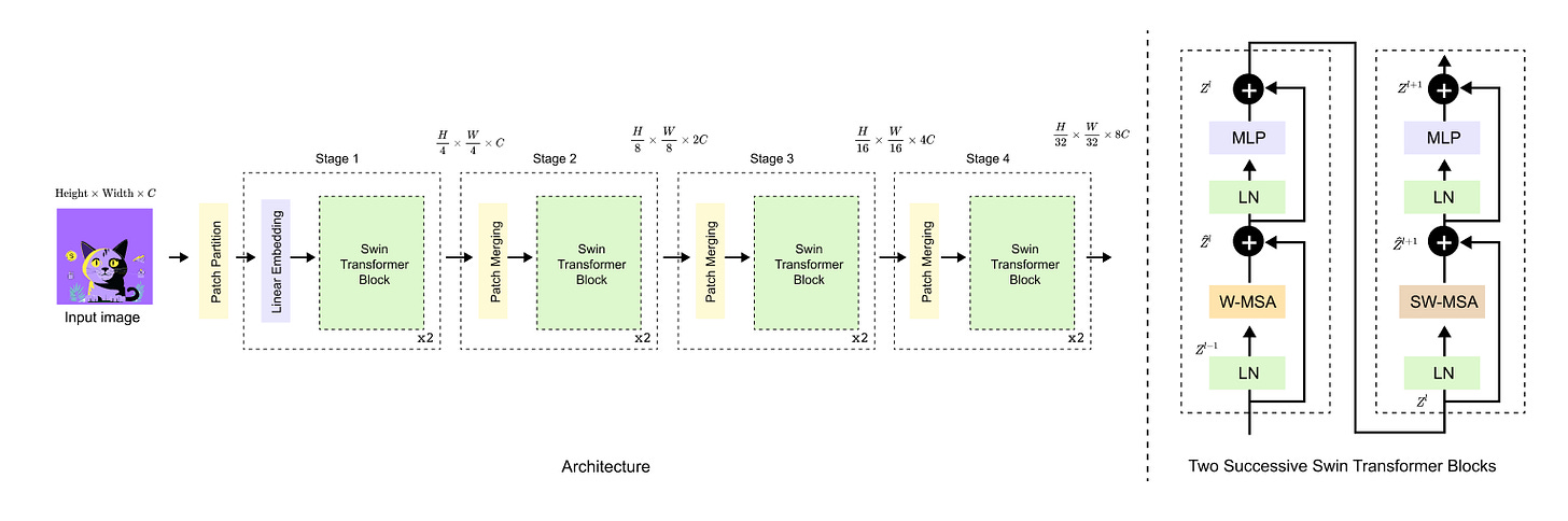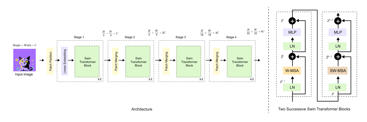 The Swin Transformer architecture is organized around two core ideas: staged hierarchical processing and localized self attention within transformer blocks. At a high level, the model is composed of multiple stages arranged sequentially, where each stage operates at a specific spatial resolution and feature dimensionality. The left portion of Figure 1.6 illustrates this overall architecture, showing how an input image is progressively transformed through a series of stages. Each stage consists of an embedding or patch merging operation followed by repeated Swin Transformer blocks. As the model advances through stages, spatial resolution is reduced while the number of feature channels increases, enabling increasingly abstract and semantically rich representations.