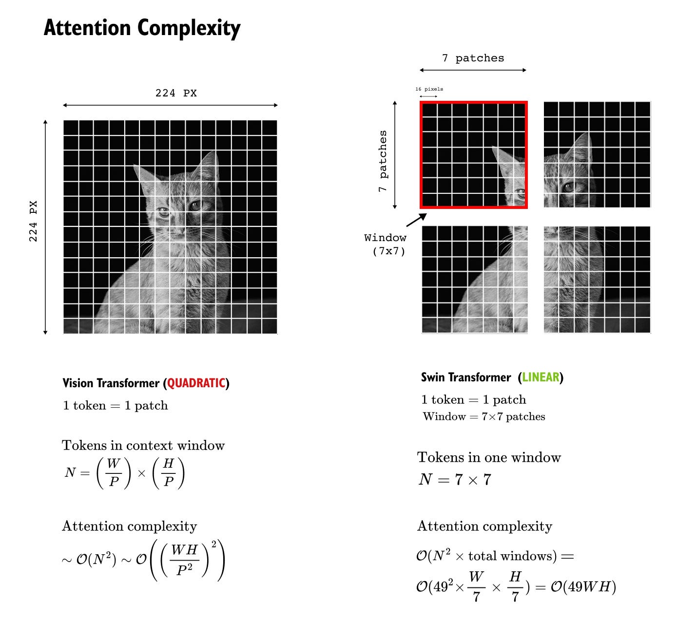 In a Vision Transformer, all N_patches tokens participate in global self attention, leading to quadratic complexity. Swin Transformer alters this computation by introducing fixed size windows.