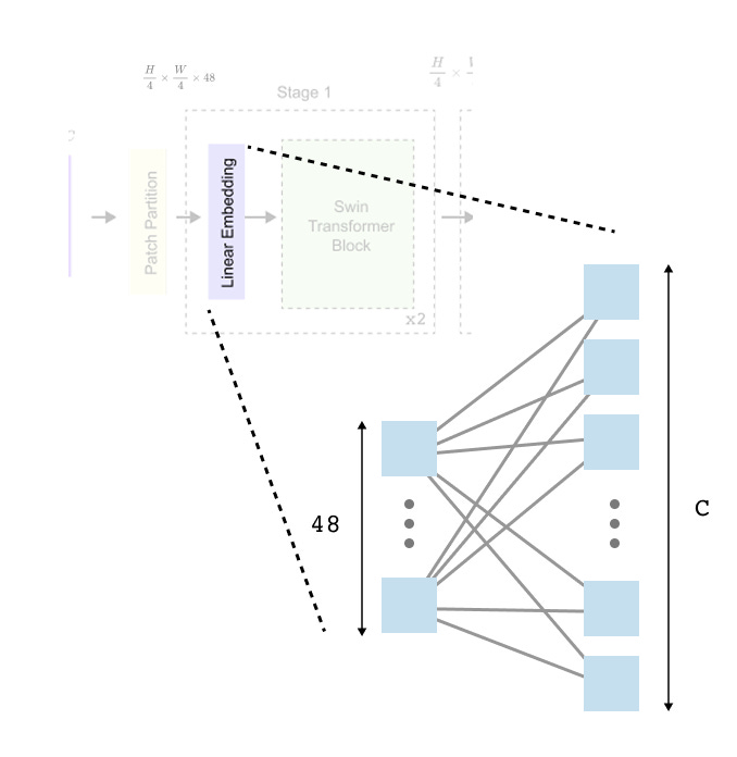 This linear embedding is equivalent to a fully connected layer applied independently to each patch. The transformation is parameterized by a weight matrix of shape 48×C , mapping each 1×48 patch vector to a 1×C embedding. After this step, all patches are represented in a common feature space, and the token dimensionality remains fixed throughout subsequent transformer blocks.