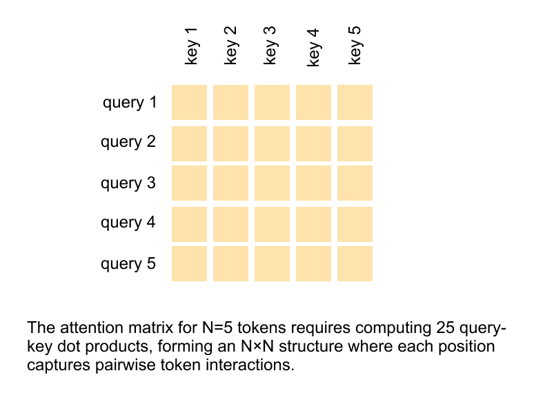 For N input tokens, self attention computes an N × N matrix of query–key dot products, capturing all pairwise token interactions and leading to quadratic computational complexity.