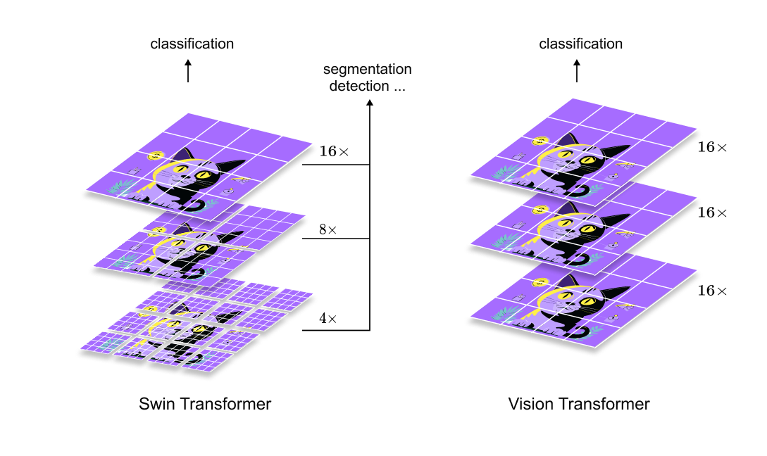 Figure 1.5 Hierarchical feature construction in Swin Transformers.
