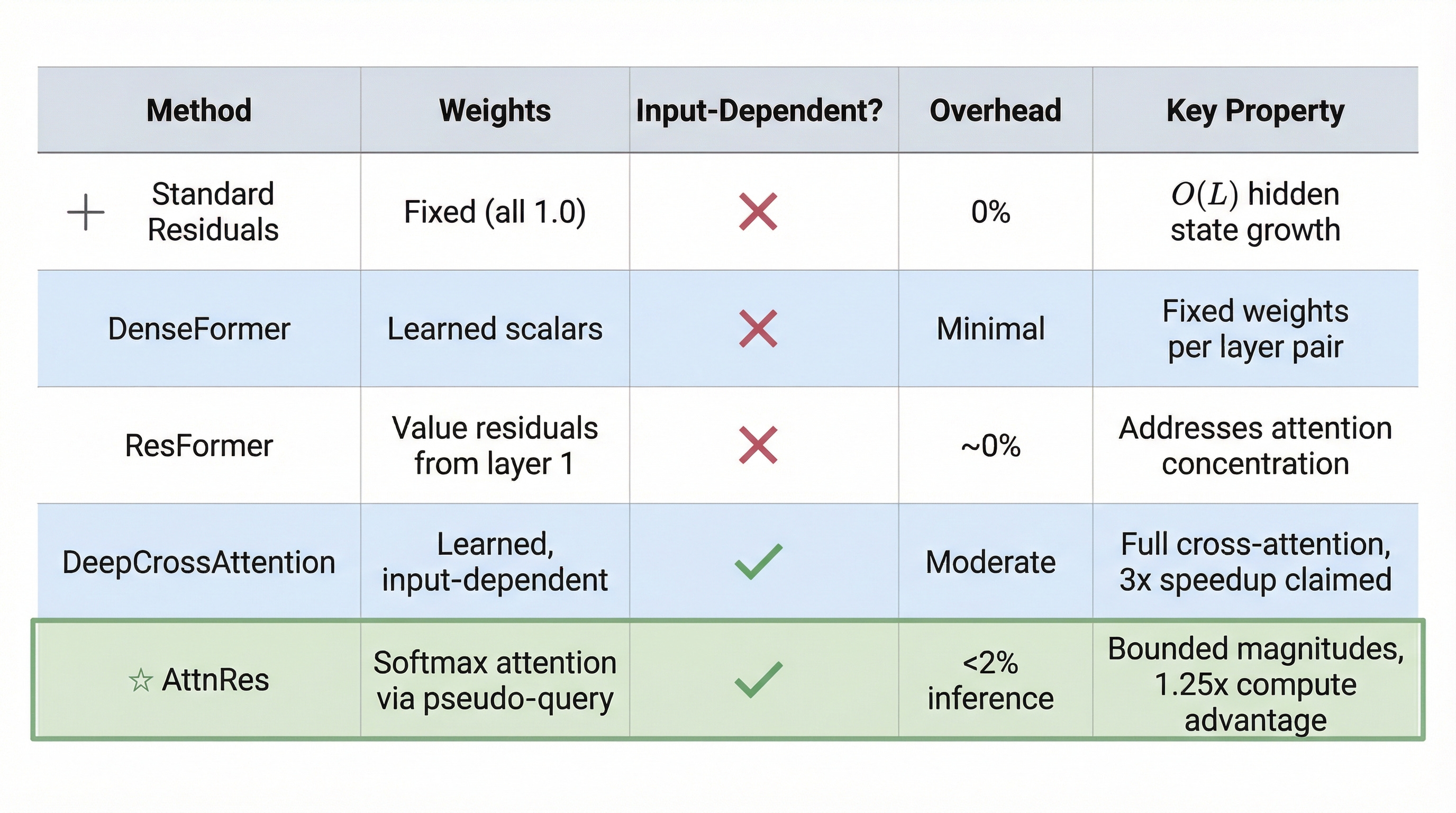 AttnRes (March 2026): Full softmax attention over depth via a single pseudo-query per layer. Less than 2% inference overhead with 1.25x compute advantage.