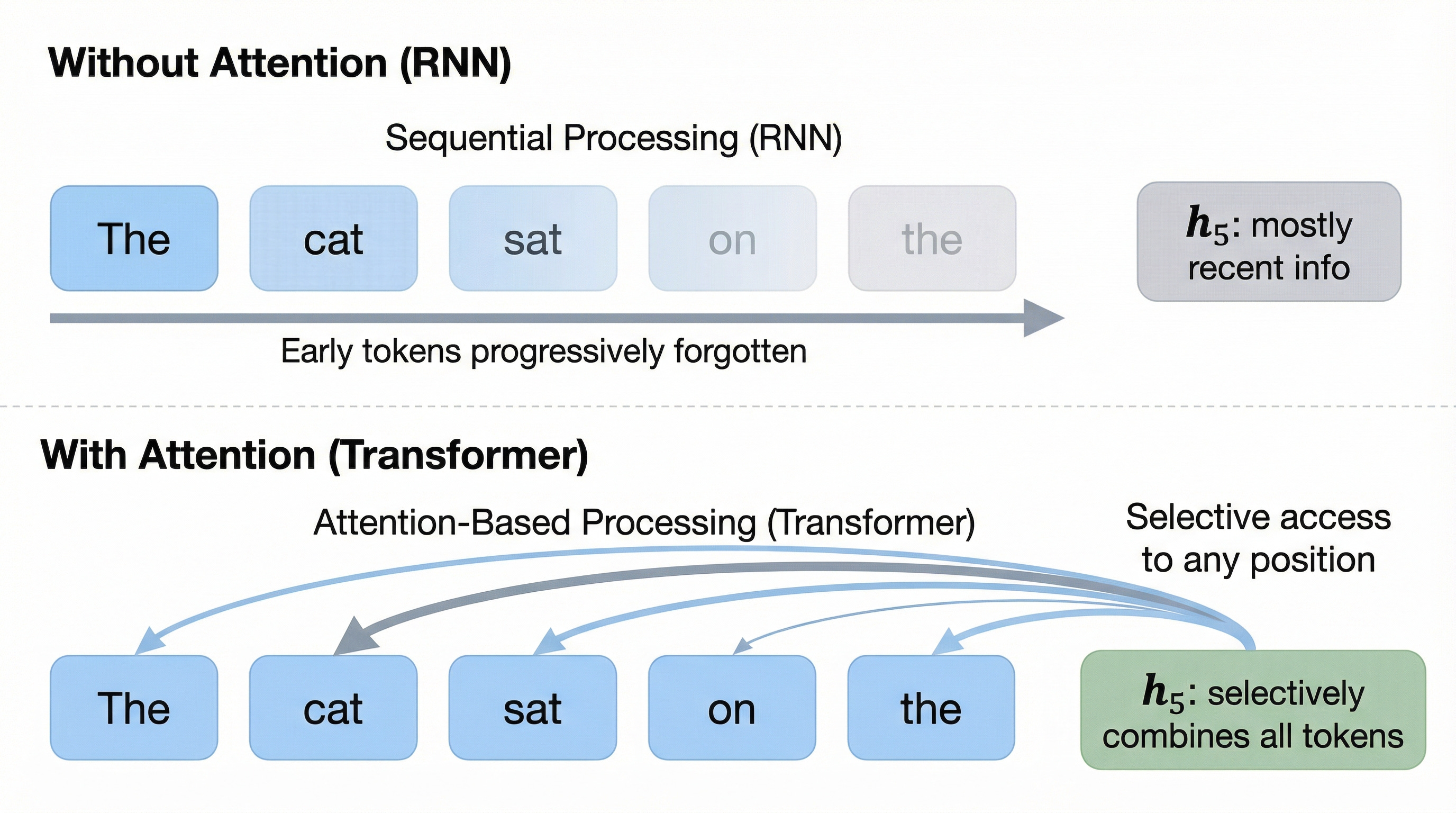 Before transformers, recurrent neural networks processed sequences by passing a hidden state from one time step to the next. Early tokens were progressively forgotten as the sequence grew, because each new token blended into the same fixed-size hidden state. This “forgetting” problem limited how far back an RNN could effectively look.