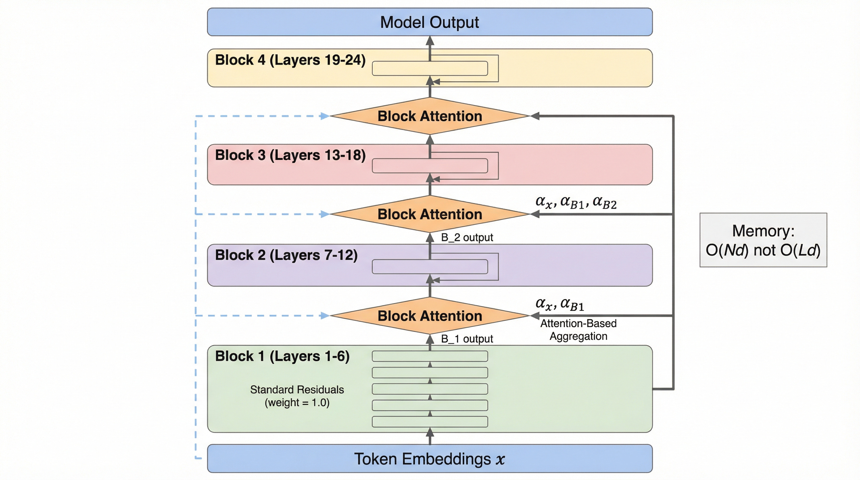 We now have the full AttnRes mechanism, but there is a practical challenge: storing all L layer outputs requires O(Ld) memory. For massive models with tens of billions of parameters, we need a more efficient approach.