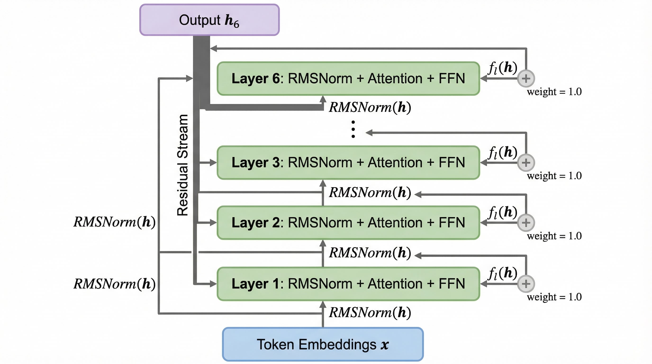 The key observation is that every layer contributes its output with the same fixed weight of 1.0. There is no mechanism for one layer to contribute more or less than any other. The running sum, often called the “residual stream,” simply accumulates all outputs equally.