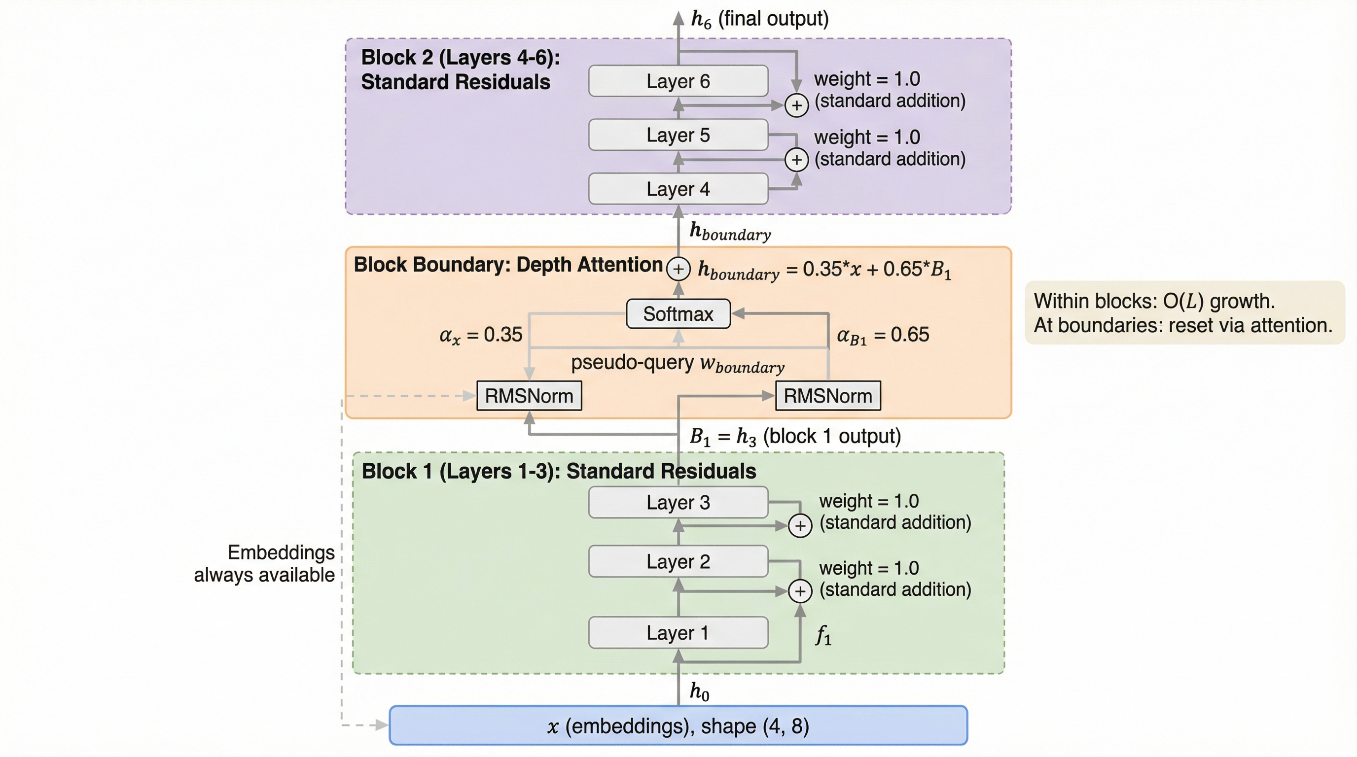 Block 1 (Layers 1-3): Standard residual connections. Each layer adds its output to the running sum. The block output B_1 = h_3 has a growing magnitude, just like in a standard transformer.