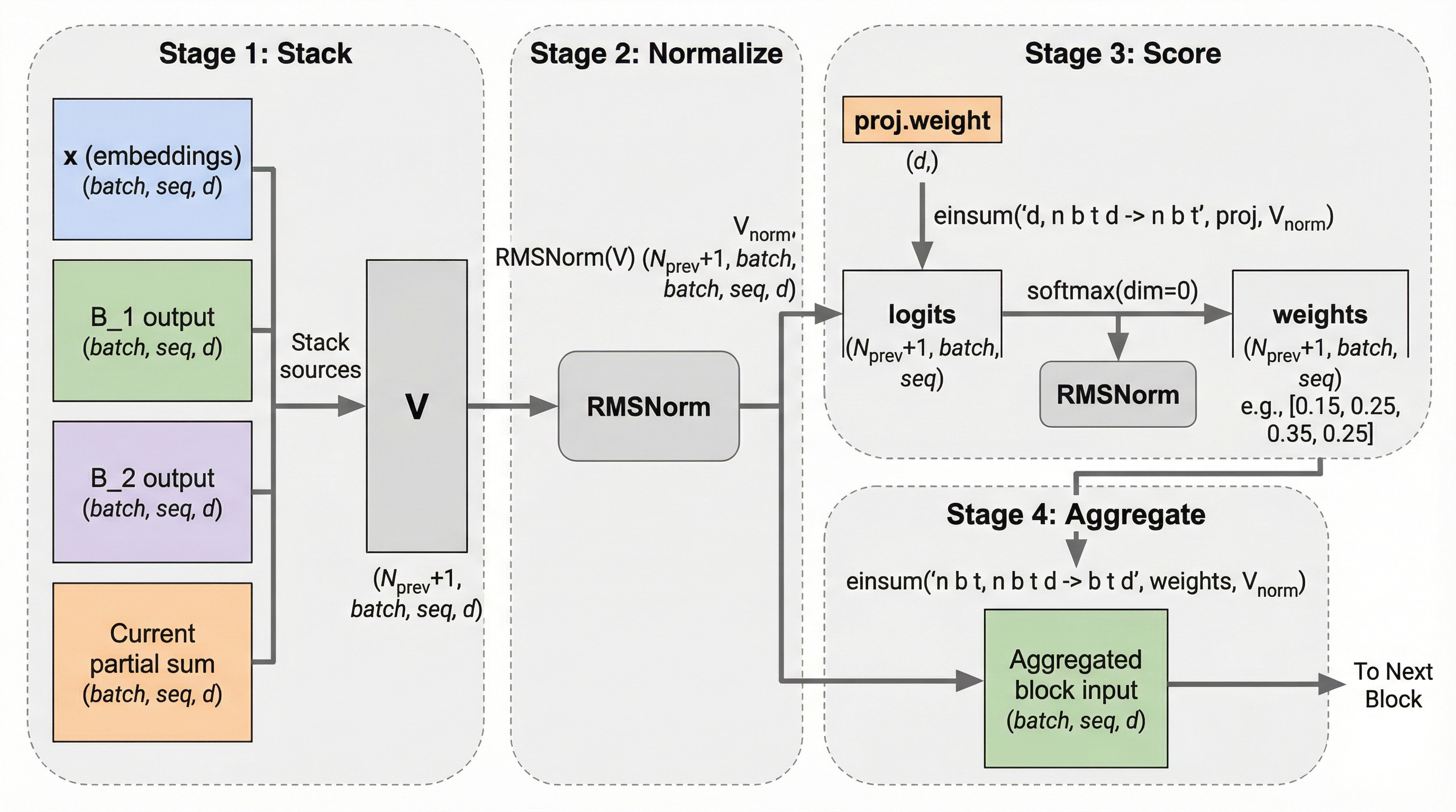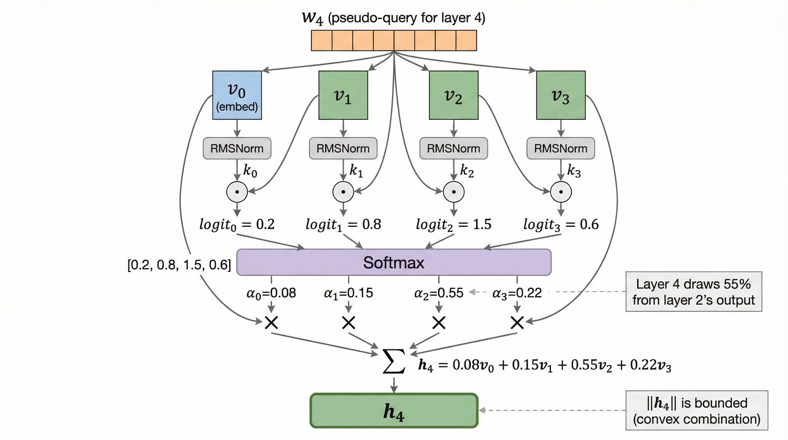 ![Figure 14. Attention weight computation for layer 4. The pseudo-query w_4 of shape (8,) is dotted with the key matrix K of shape (4, 8) containing the RMSNorm-normalized outputs from layers 0-3. The dot products produce logits of shape (4,): [0.2, 0.8, 1.5, 0.6]. After softmax, the resulting weights are alpha_0=0.08, alpha_1=0.15, alpha_2=0.55, alpha_3=0.22. The bar chart shows that layer 4 draws 55% of its input from layer 2's output, making it the dominant source. Figure 14. Attention weight computation for layer 4. The pseudo-query w_4 of shape (8,) is dotted with the key matrix K of shape (4, 8) containing the RMSNorm-normalized outputs from layers 0-3. The dot products produce logits of shape (4,): [0.2, 0.8, 1.5, 0.6]. After softmax, the resulting weights are alpha_0=0.08, alpha_1=0.15, alpha_2=0.55, alpha_3=0.22. The bar chart shows that layer 4 draws 55% of its input from layer 2's output, making it the dominant source.](https://substackcdn.com/image/fetch/$s_!NACG!,w_1456,c_limit,f_auto,q_auto:good,fl_progressive:steep/https%3A%2F%2Fsubstack-post-media.s3.amazonaws.com%2Fpublic%2Fimages%2Faf21c5b3-0df5-4d0a-b1d2-9ed0e8a35310_2752x1536.png)