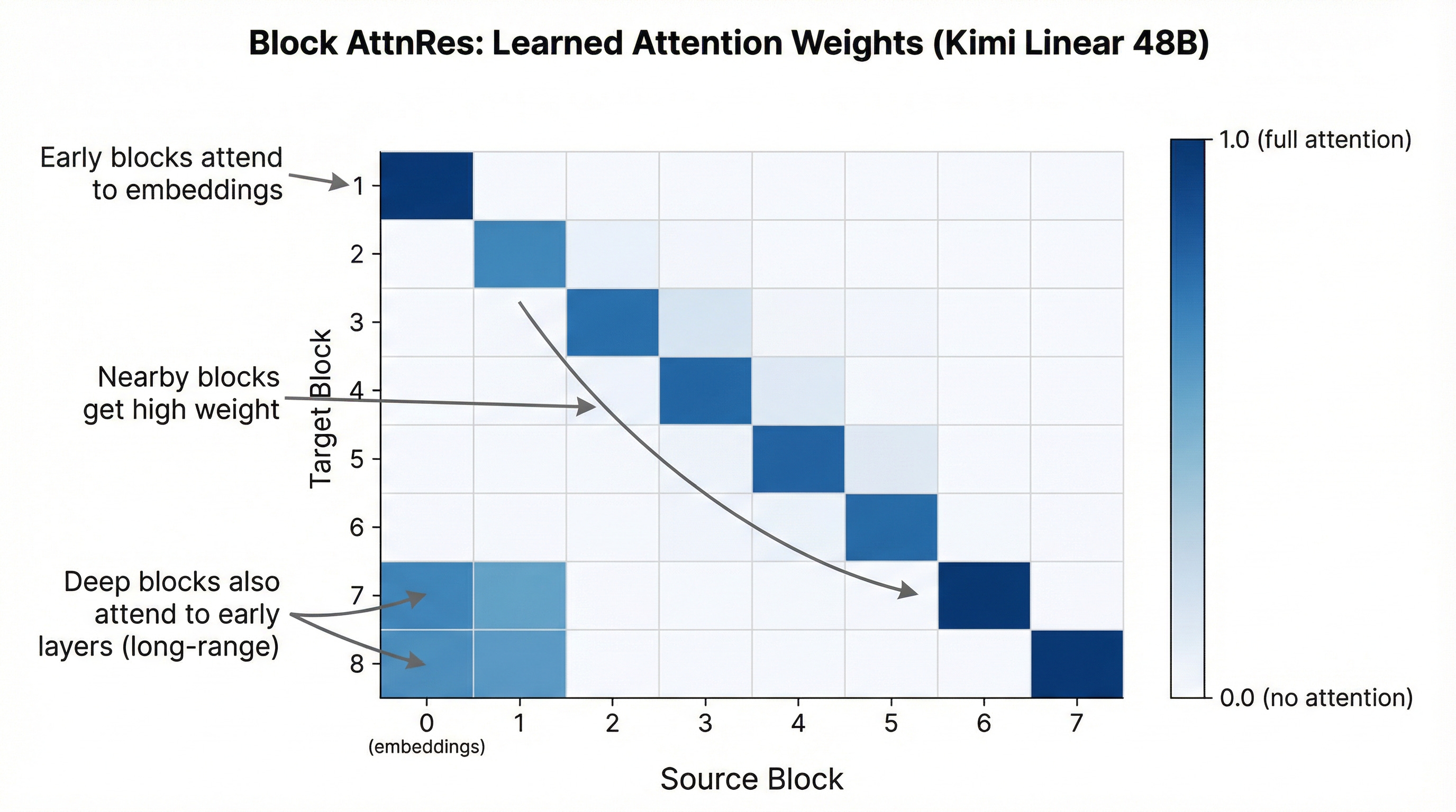 The most illuminating way to understand AttnRes is to examine what the model actually learns. What patterns do the attention weights develop? How do different blocks interact?