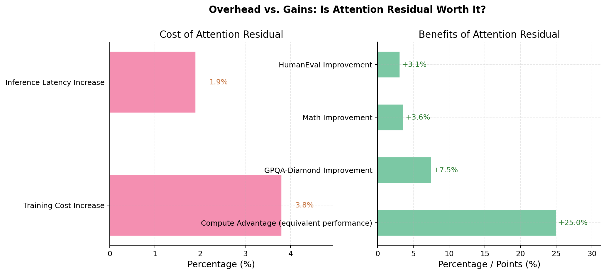 Quantified improvements: Block AttnRes achieves a 1.25x compute advantage, matching baseline models trained with 25% more resources. On Kimi Linear (48B total, 3B activated, 1.4T tokens), it improved GPQA-Diamond by +7.5 points, Math by +3.6 points, and HumanEval by +3.1 points. The largest gains appear in multi-step reasoning tasks. AttnRes also shifts the optimal architecture toward deeper, narrower models that more effectively utilize their depth.