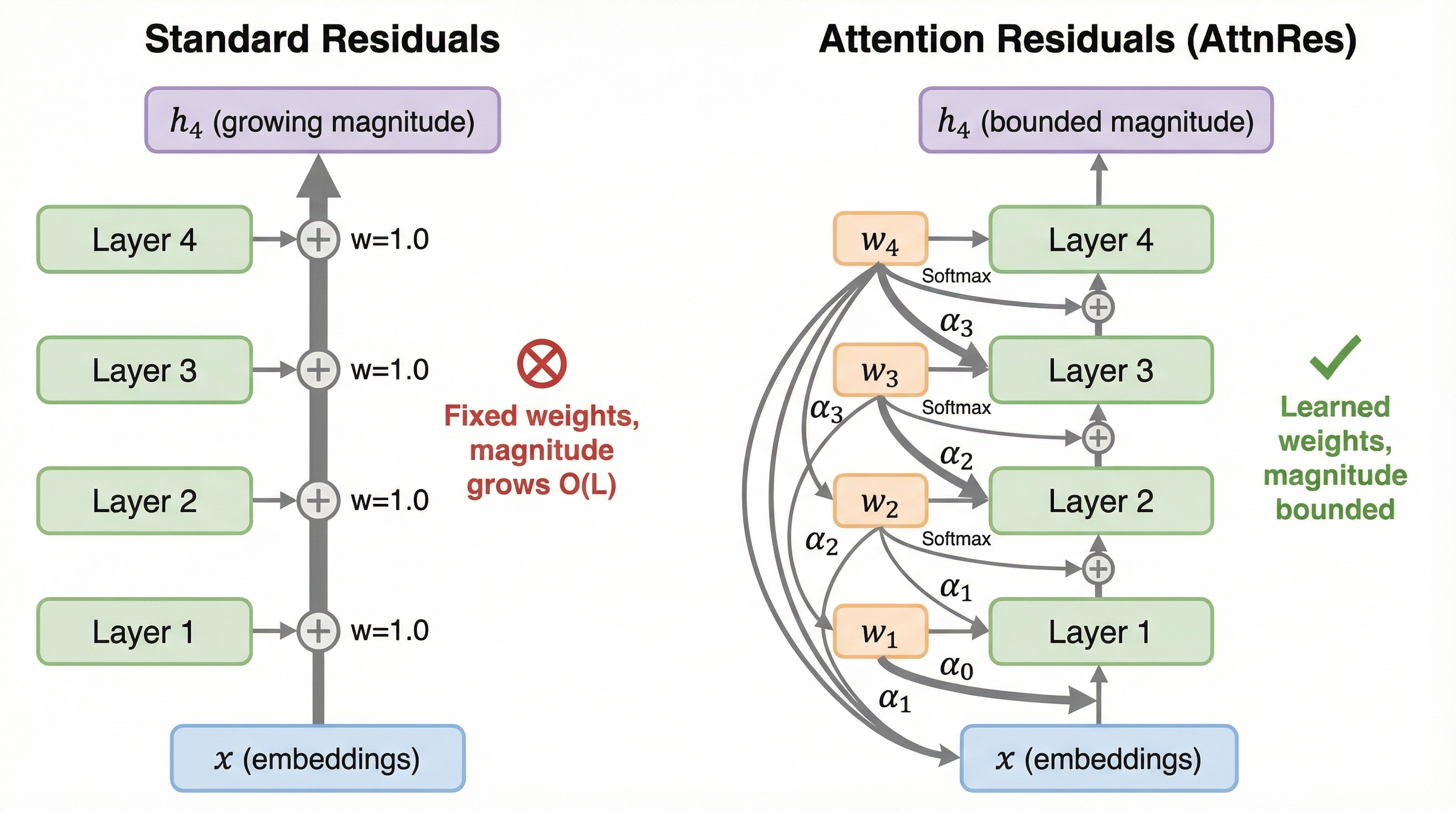 ![Figure 13. AttnRes computation at layer 4 in detail. The pseudo-query w_4 computes dot products with RMSNorm-normalized representations from layers 0 through 3, producing logits [0.2, 0.8, 1.5, 0.6]. After softmax, the weights are alpha_0=0.08, alpha_1=0.15, alpha_2=0.55, alpha_3=0.22. The output h_4 = 0.08*v_0 + 0.15*v_1 + 0.55*v_2 + 0.22*v_3 is bounded because the weights form a convex combination. Figure 13. AttnRes computation at layer 4 in detail. The pseudo-query w_4 computes dot products with RMSNorm-normalized representations from layers 0 through 3, producing logits [0.2, 0.8, 1.5, 0.6]. After softmax, the weights are alpha_0=0.08, alpha_1=0.15, alpha_2=0.55, alpha_3=0.22. The output h_4 = 0.08*v_0 + 0.15*v_1 + 0.55*v_2 + 0.22*v_3 is bounded because the weights form a convex combination.](https://substackcdn.com/image/fetch/$s_!wekb!,w_1456,c_limit,f_auto,q_auto:good,fl_progressive:steep/https%3A%2F%2Fsubstack-post-media.s3.amazonaws.com%2Fpublic%2Fimages%2Ff132bdc9-1291-40b0-af92-07b86eb35ea2_2752x1536.png)