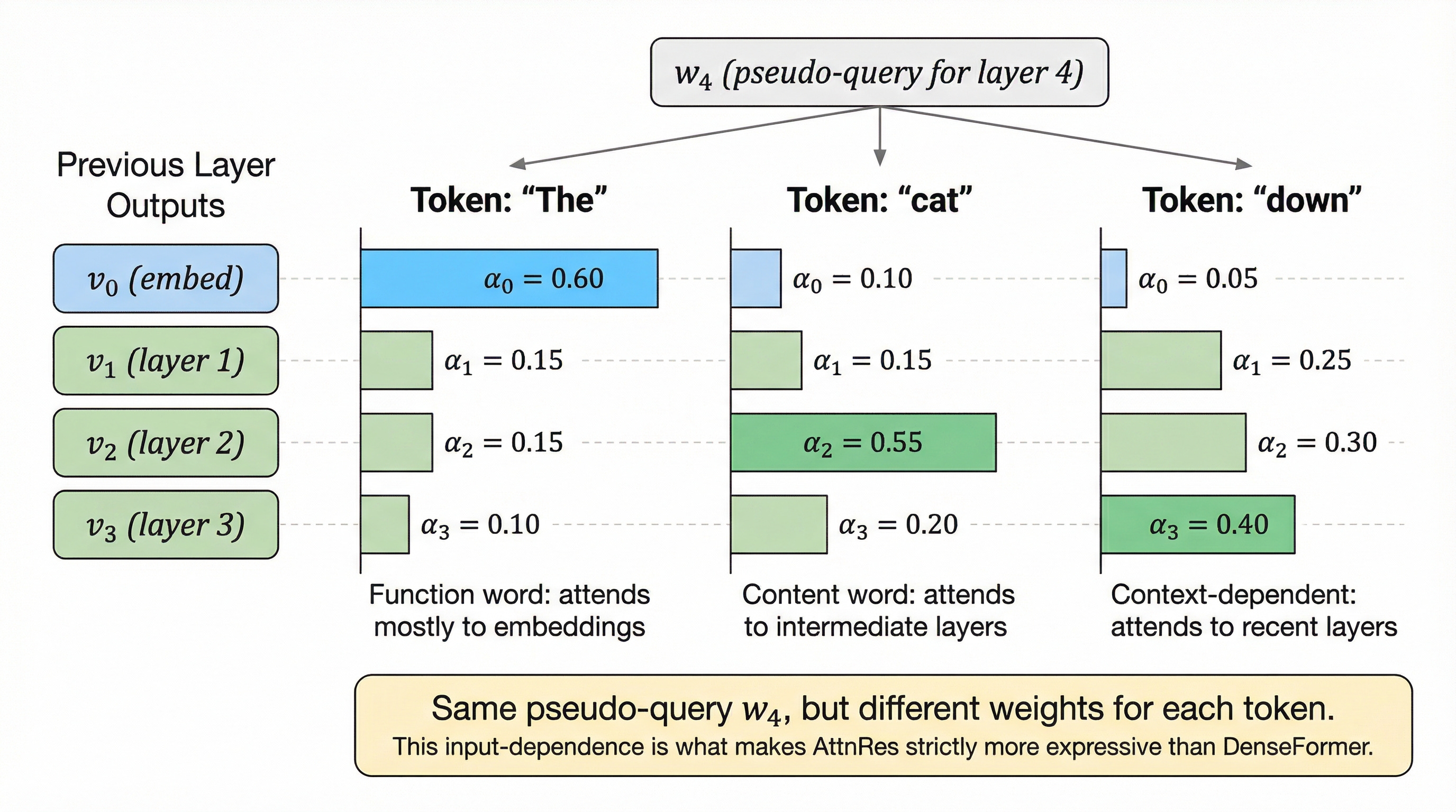 This is the key advantage over fixed-weight approaches. DenseFormer uses the same weights for every token; AttnRes adapts its layer selection to each token individually.