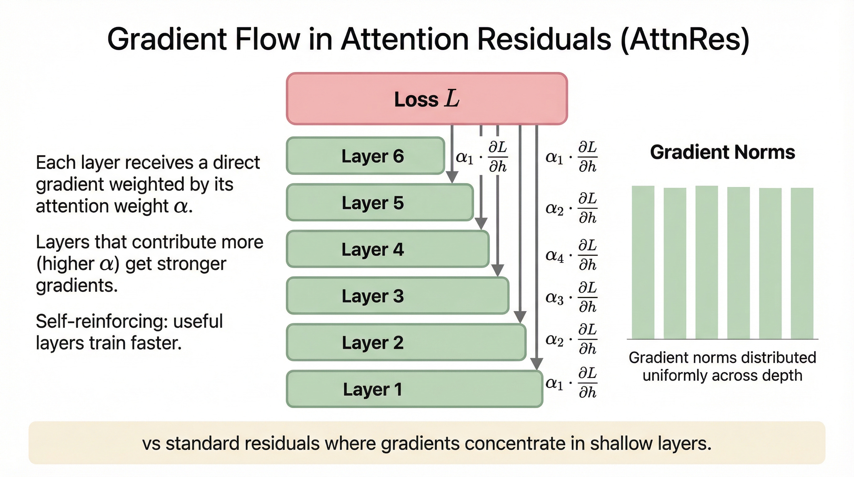 The second mathematical advantage concerns gradient flow during training. In standard residuals, gradients must propagate backward through a chain of multiplicative terms. In AttnRes, each layer receives a direct gradient signal.