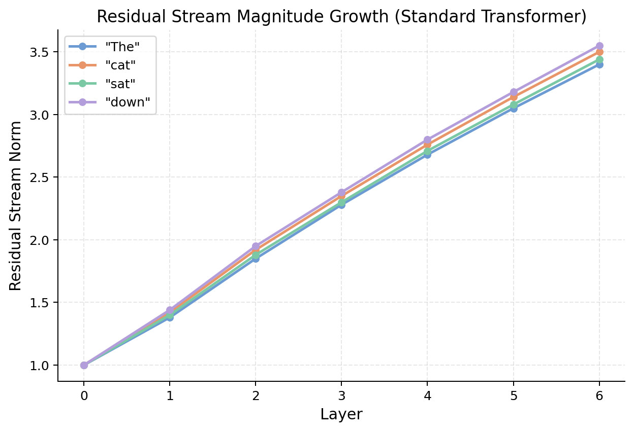 As illustrated in figure 11, all four tokens exhibit the same monotonic growth pattern. The norms rise from 1.0 at the embedding layer to between 3.4 and 3.6 by layer 6. This confirms that the dilution problem is universal across all tokens, not specific to any particular input.