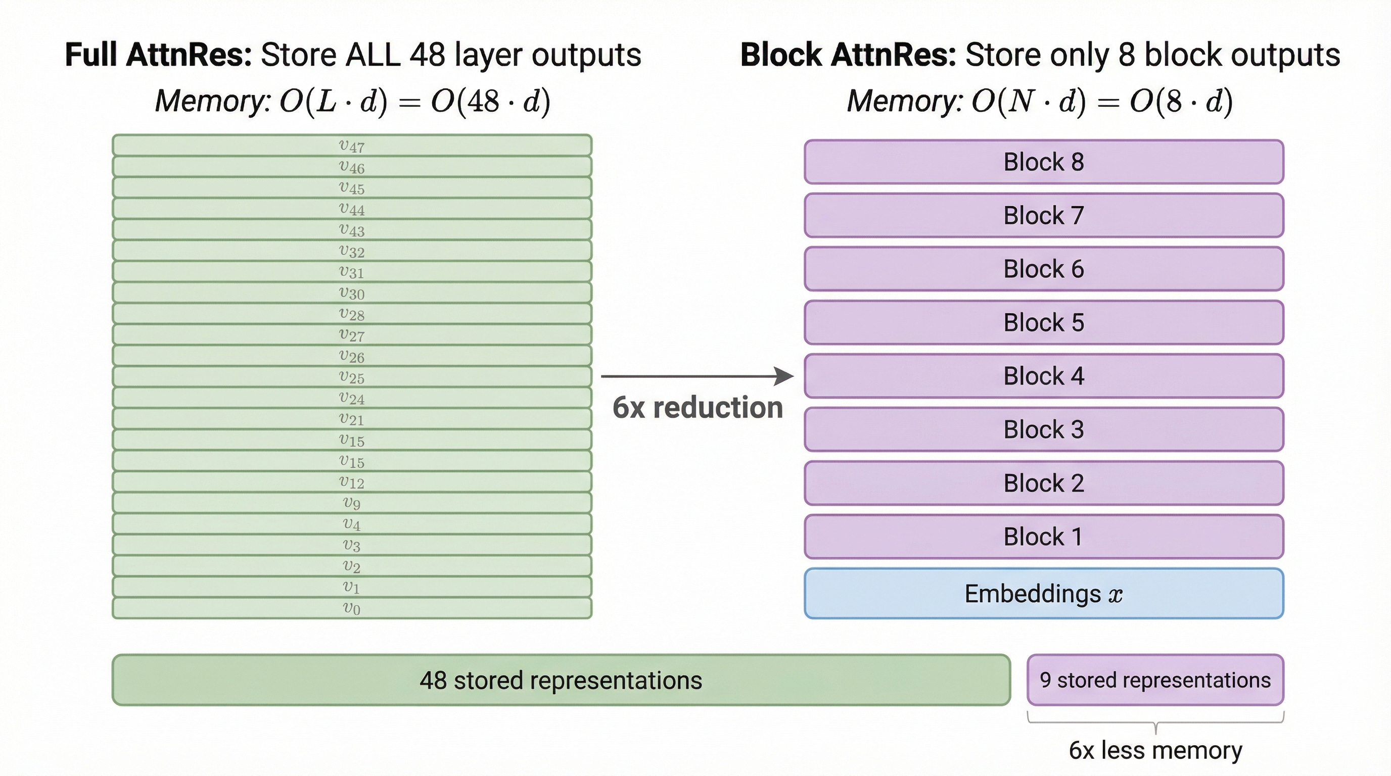 Full AttnRes is elegant but expensive. At layer l, we need to store all l-1 previous outputs, each of dimension d. For a 48-layer model with d = 8192, this represents significant memory overhead. In pipeline-parallel training, where different layers live on different GPUs, the situation is even more challenging.