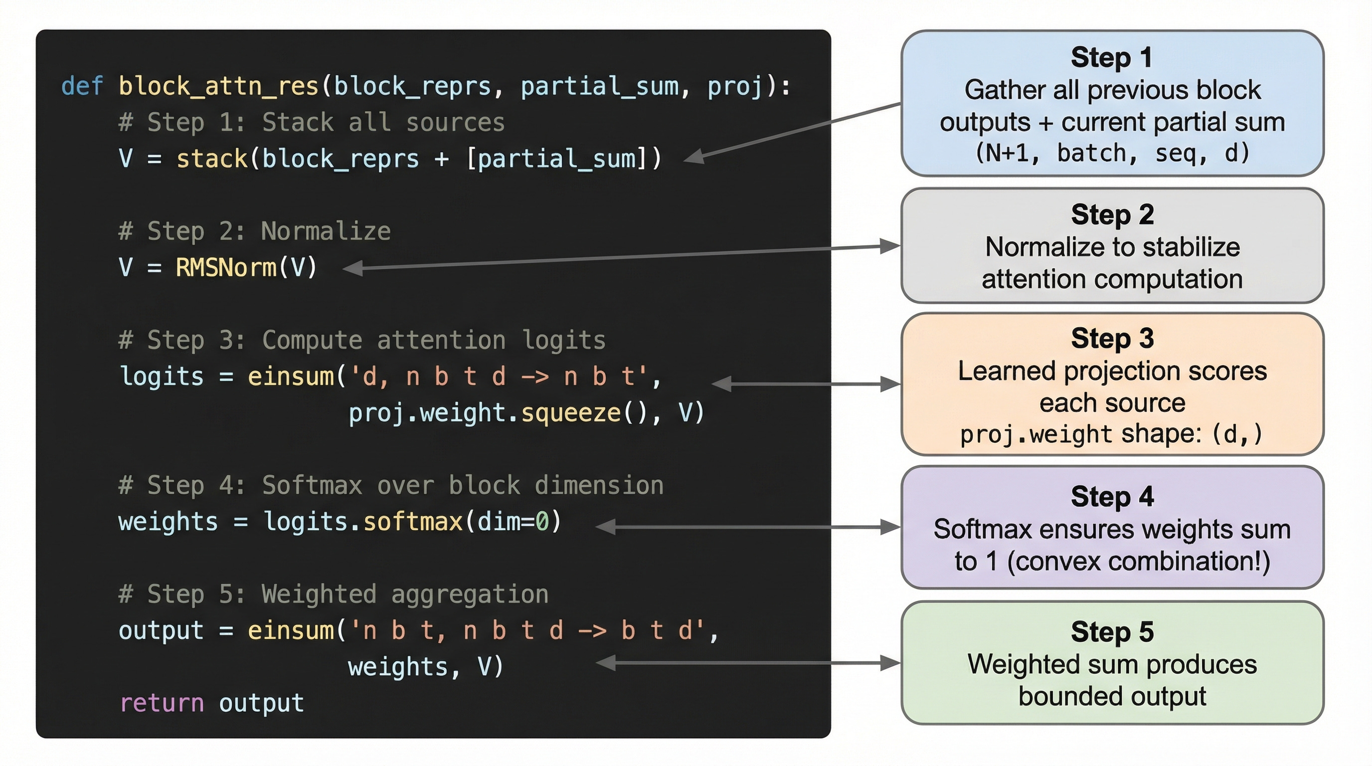 return outputThe function takes the previous block representations, the current block’s partial sum, and a learned projection (the pseudo-query). The stack, normalize, score, softmax, aggregate pattern is clean and efficient. Adding Block AttnRes to an existing transformer requires modifying only the block boundary logic, making it a true drop-in replacement for standard residual connections.
