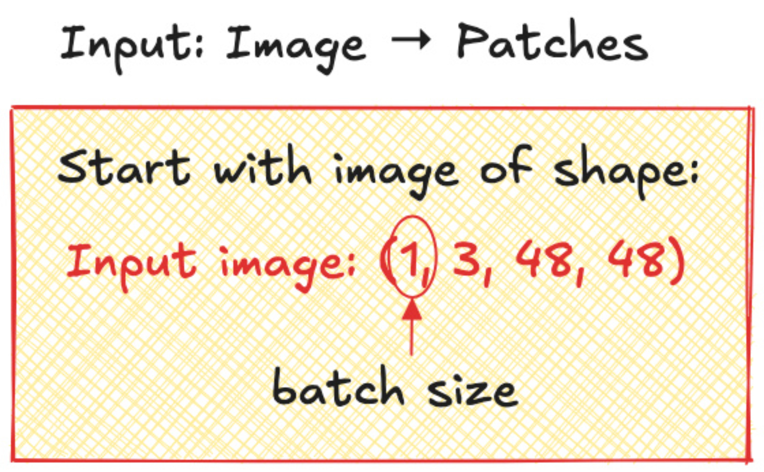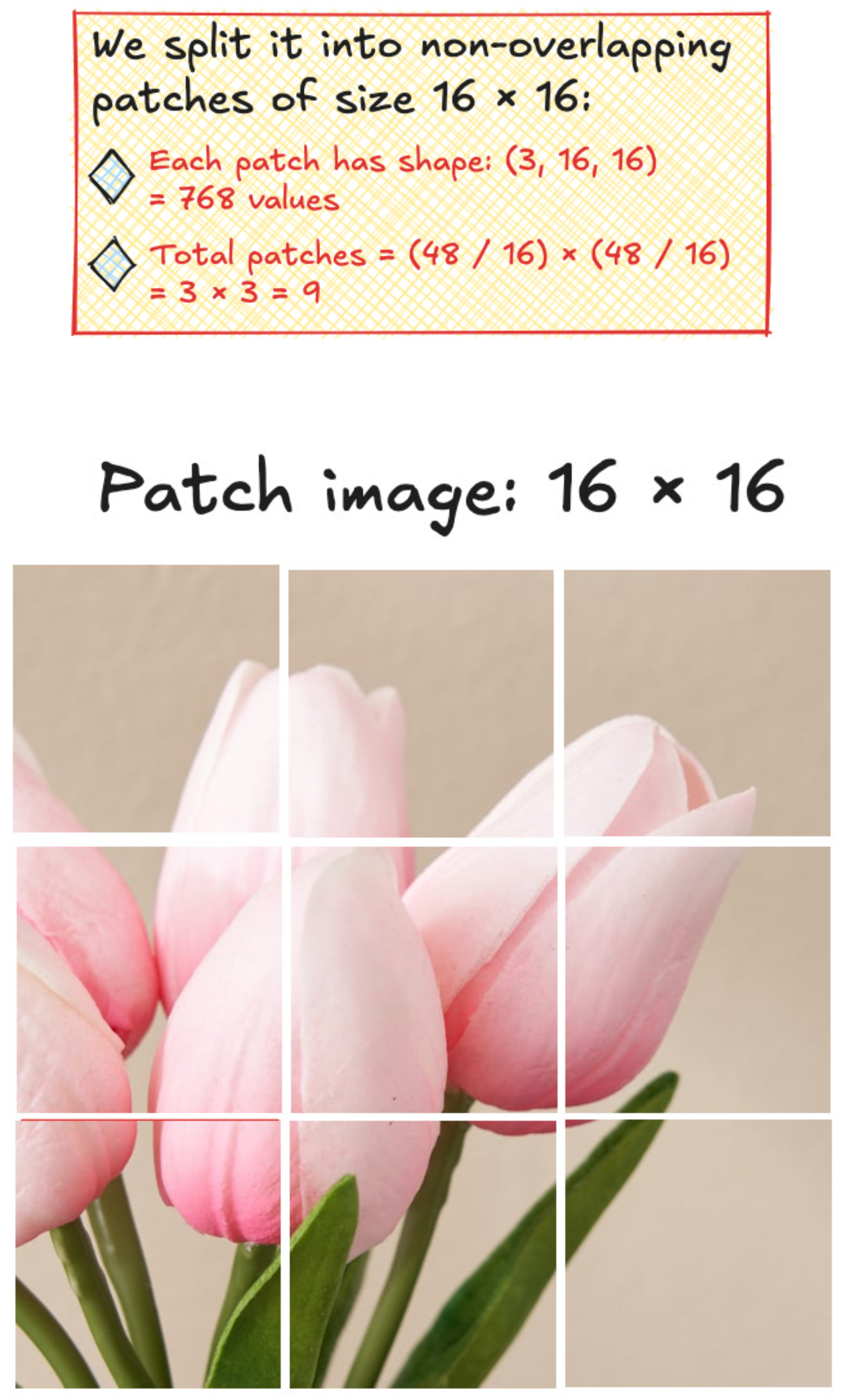 An image is divided into patches, like 16x16 squares. Each patch is then flattened and projected into a vector of fixed dimension - say, 768. Just as a sentence in NLP becomes a sequence of word embeddings, the image becomes a sequence of patch embeddings.