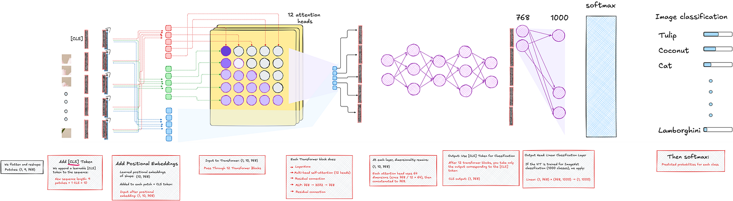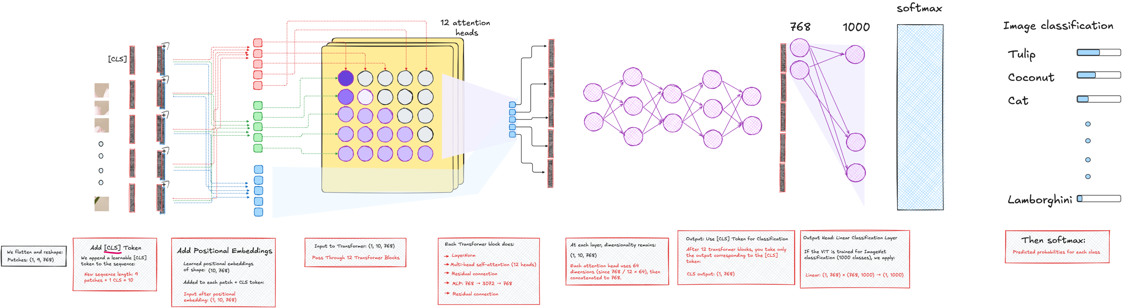 The resulting sequence is then fed into a transformer encoder. Each encoder block consists of multi-head attention, layer normalization, residual connections, and an MLP. After several such blocks, we extract the CLS token and pass it through another MLP head to perform classification.