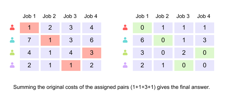 The highlighted zeros correspond to the optimal worker–job pairing. Although the transformed matrix yields a zero total cost, this is an artifact of the normalization process. To recover the true minimum cost, the selected assignments are mapped back to the original cost matrix. Summing the original costs associated with the selected pairs yields the final minimum total cost.