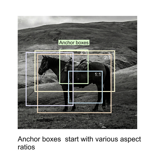 Figure 1.4 illustrates this idea. At a single spatial location, multiple anchor boxes with different aspect ratios are defined. Some boxes are nearly square, while others are elongated horizontally or vertically. By starting from these diverse shapes, the model can better handle objects with varying geometries, including extreme aspect ratios that arise due to viewpoint changes or object pose.