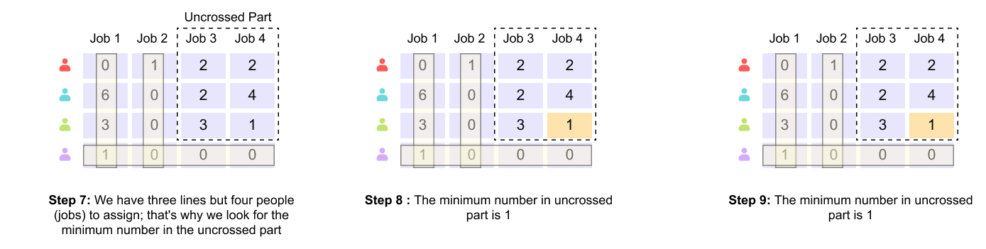 Figure 1.16 Steps 7–9: covering zero entries and identifying the need for further adjustment.