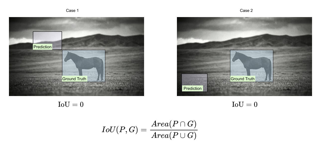 In both cases shown above, the predicted box does not intersect the ground-truth box, and IoU assigns a value of zero. However, from a learning perspective, the first prediction is clearly better than the second because it is closer to the target. IoU provides no gradient signal that reflects this difference, which leads to poor optimization behavior during training.