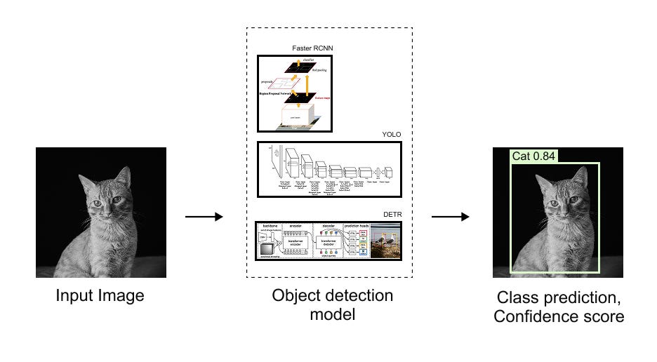 Figure 1.3 High level object detection pipeline illustrating how an input image is processed by an object detection model to produce localized bounding boxes, along with corresponding class predictions and confidence scores.
