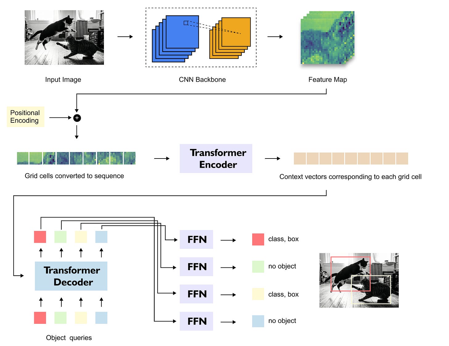 At a high level, DETR consists of four major components: a convolutional backbone for feature extraction, a transformer encoder for global contextual reasoning, a transformer decoder driven by object queries, and lightweight prediction heads that output class labels and bounding boxes. The interaction between these components enables DETR to jointly reason about object presence, category, and spatial localization.
