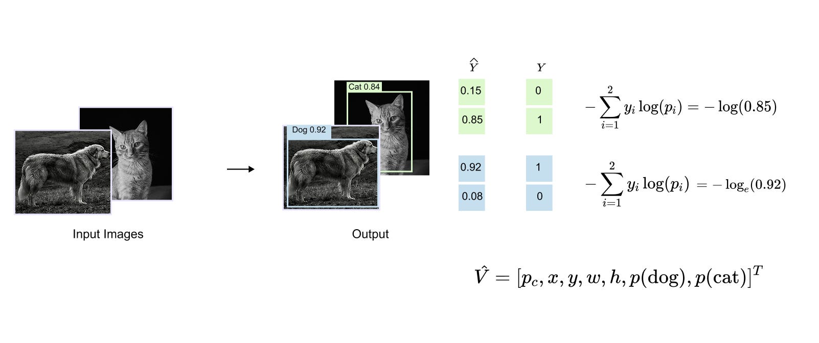 The distinction between object detection and image classification becomes clear when examining the structure of their model outputs and the losses used during training. In a standard classification task, the model processes an entire image as a single unit and produces a probability vector over the available classes. The corresponding ground truth is typically represented as a one hot encoded vector, and learning is driven by a cross entropy loss that measures the discrepancy between the predicted probability distribution and the true class label.