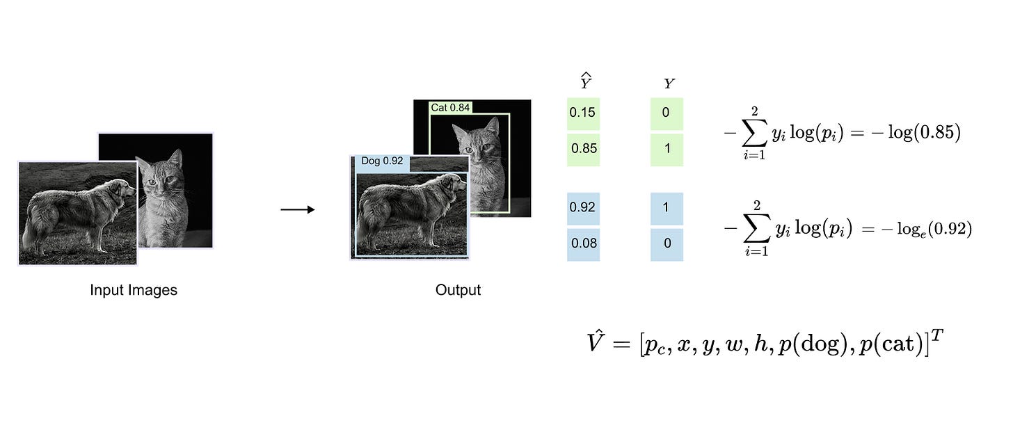 Figure 1.4 illustrates this idea in the context of class prediction, showing how the model outputs a probability distribution for each detected object and how this distribution is compared against the one hot encoded ground truth using a cross entropy loss. Together, these loss components enable object detection models to jointly learn accurate localization and reliable classification within a unified optimization framework.
