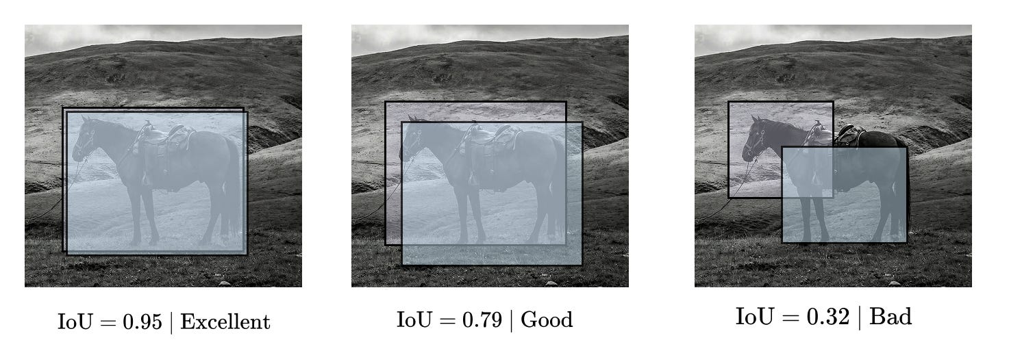 Intersection over Union illustrated as the ratio between overlapping area and total union area, with examples ranging from excellent to poor overlap.