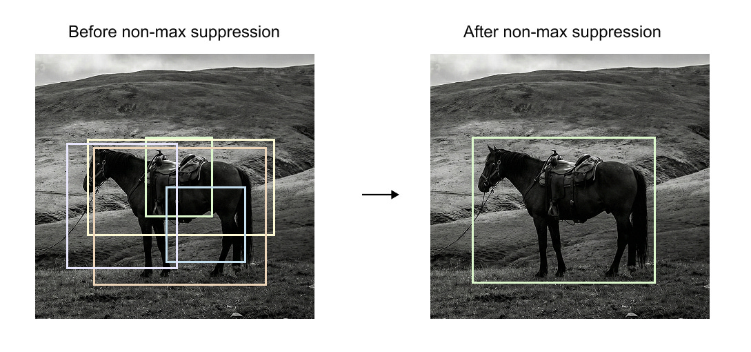 Figure 1.5 shows the effect of this process. Before non maximum suppression, many overlapping boxes are present around the same object. After applying NMS, only a single bounding box remains, corresponding to the highest confidence prediction.