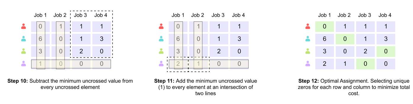 Figure 1.17 Steps 10–12: matrix adjustment and emergence of a complete zero-cost assignment.