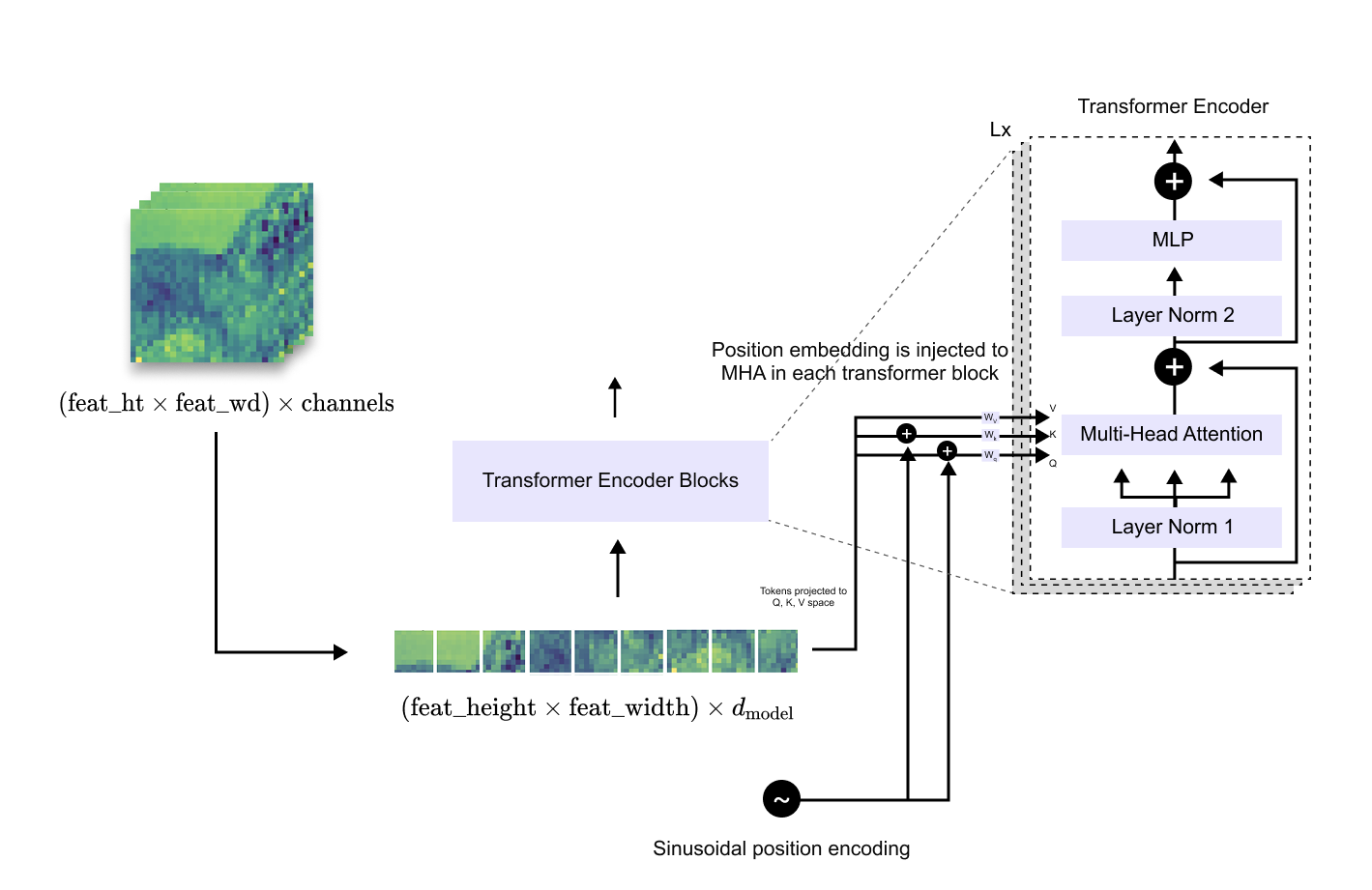 Before feeding this sequence into the transformer, a linear projection is applied to map each feature vector from channel dimension C into the transformer’s embedding dimension d_model