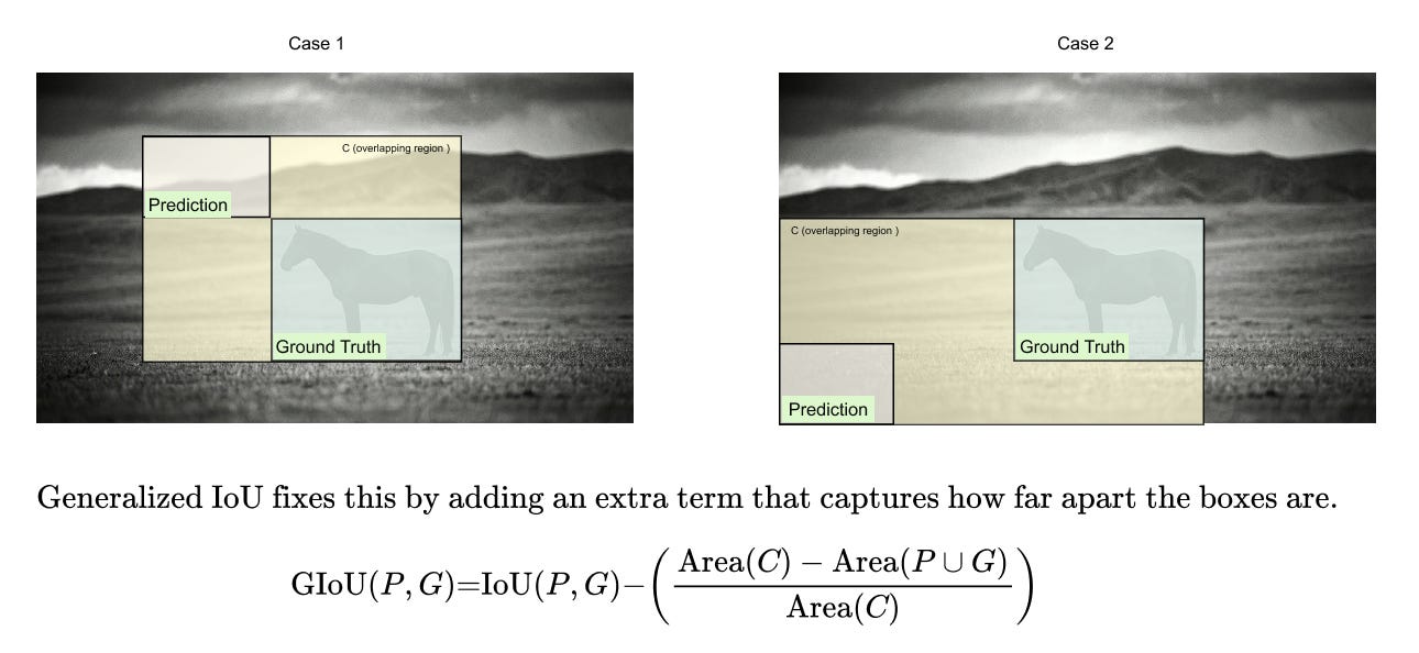 To address this limitation, Generalized IoU (GIoU) introduces an additional geometric term that accounts for the distance between boxes. Let C denote the smallest enclosing rectangle that contains both the prediction P and the ground truth G. Generalized IoU is defined as