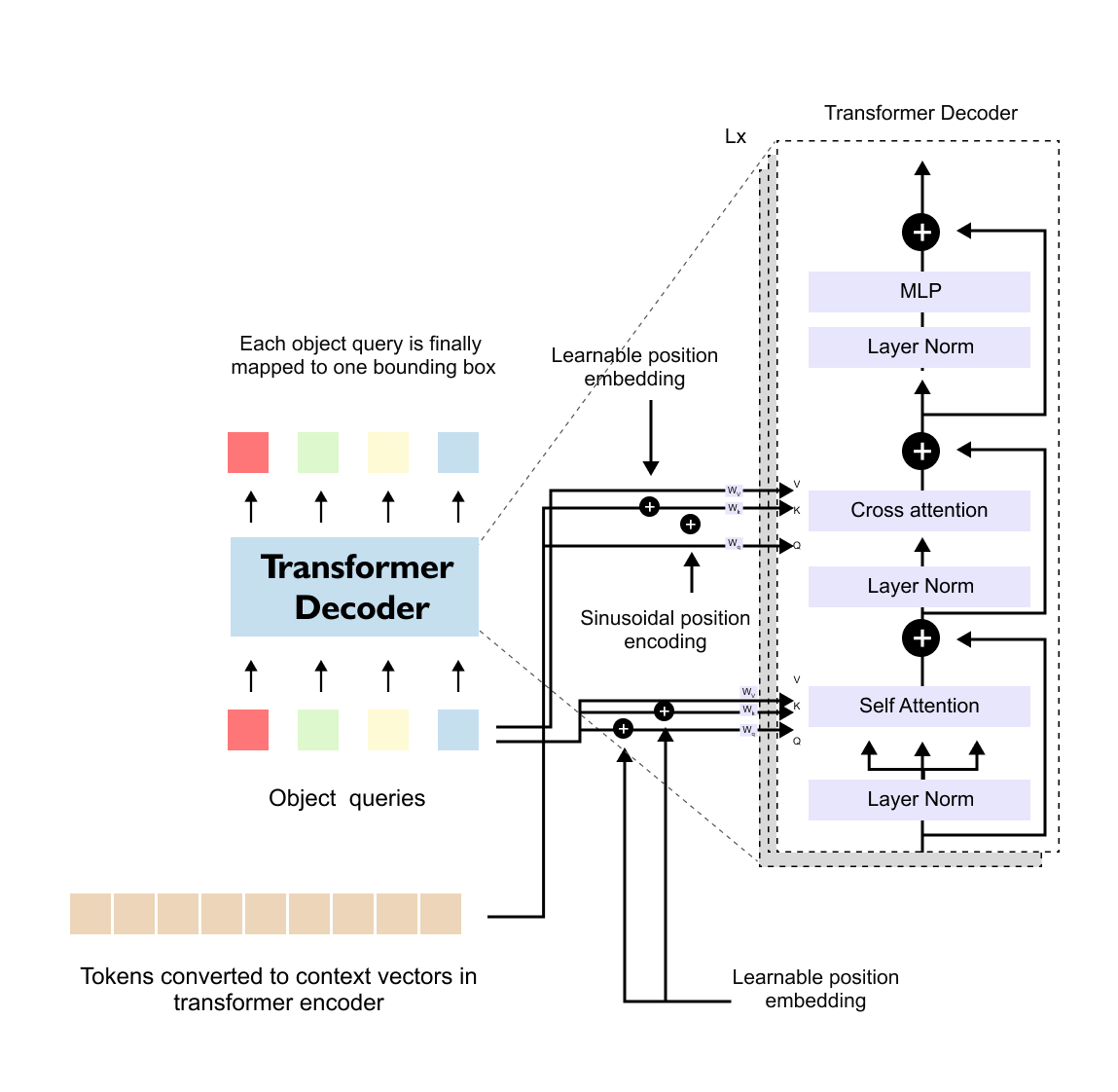 Unlike image tokens, object queries do not have an inherent spatial ordering. As a result, DETR uses learnable positional embeddings for object queries instead of sinusoidal ones. These embeddings are trained jointly with the rest of the model and allow the decoder to differentiate between individual query slots.
