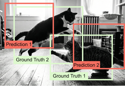 Figure 1.20 Two non-overlapping prediction–ground-truth pairs with identical IoU values of zero. Although one prediction is spatially much closer to the ground truth than the other, IoU fails to distinguish between them.