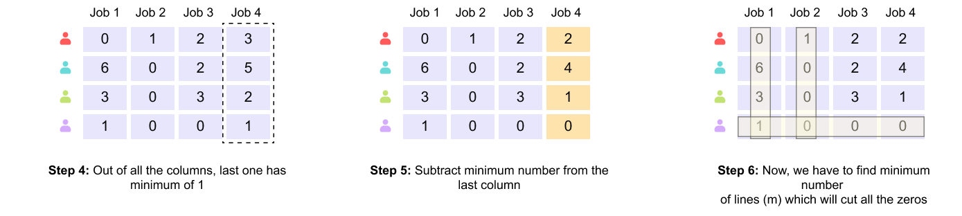 In Step 5, the minimum value of the last column, which is nonzero, is subtracted from all elements in that column. As with row normalization, this operation preserves the optimal assignment while introducing additional zeros.