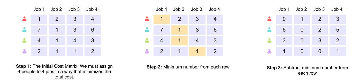 In Step 2, the minimum value in each row is identified. This value represents the cheapest job that a particular worker can perform.