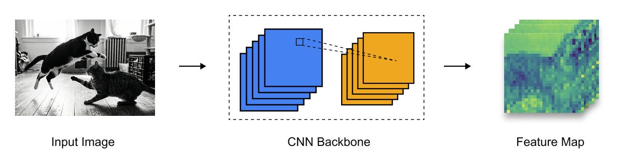 Figure 1.9 Conversion of an input image into a dense feature map using a CNN backbone, where spatial resolution is reduced and semantic richness is increased.