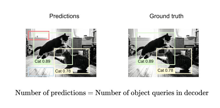 Crucially, there is a one-to-one correspondence between object queries and predictions: each query produces exactly one class prediction and one bounding box. The full output of DETR is therefore a set of predictions, whose size is fixed by design and independent of the image content.