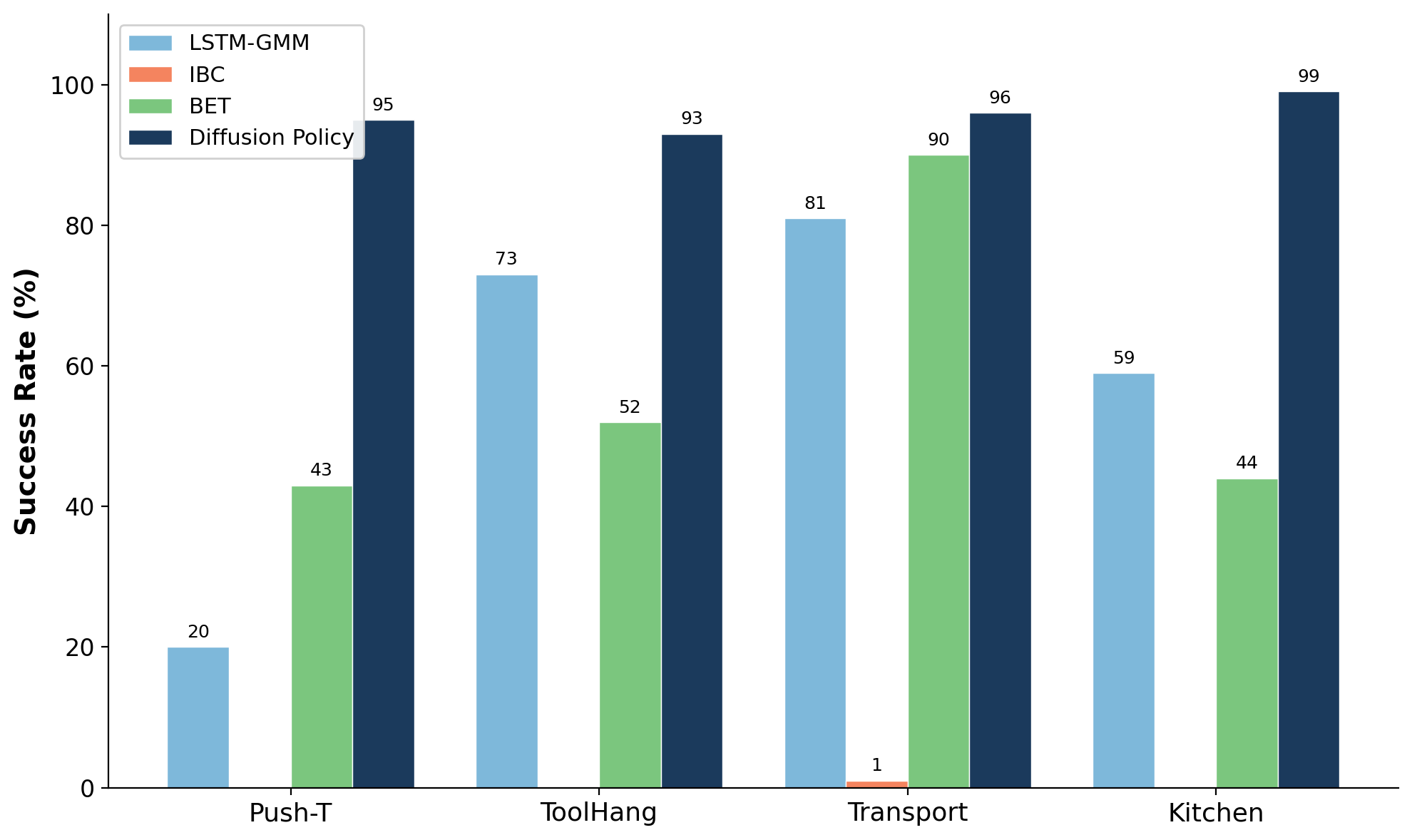 Transport (bimanual manipulation — two arms must coordinate): Diffusion Policy achieves 96% success, outperforming all baselines.