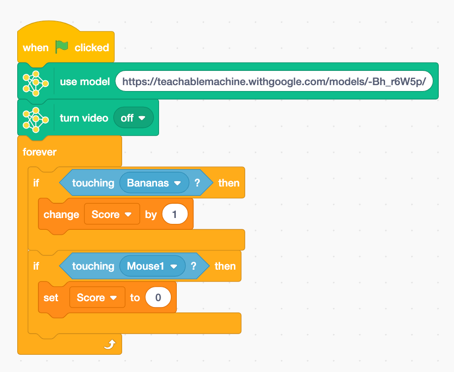 Rather than use the regular Scratch interface, I used a platform called Playground by MIT RAISE. It offers the same block-style interface as Scratch but with one important addition- it allows you to import models from Teachable Machine and interact with real-world input like video and gestures.