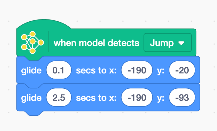 When the model detected the "Jump" class, I told the character to glide upward on the screen, simulating a jump. I set the vertical y coordinate to rise quickly (in 0.1 seconds) and fall back slowly (in 2.5 seconds), creating a sense of gravity.