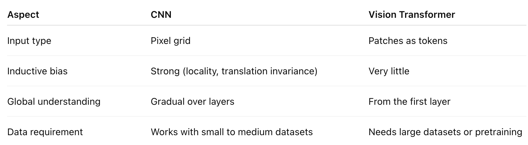 Vision Transformers do not assume anything about images. They have to learn spatial structure completely from training data. This is powerful but data hungry. Hence, ViTs are usually pretrained on very large datasets like ImageNet 21k or JFT 300M and later fine tuned.