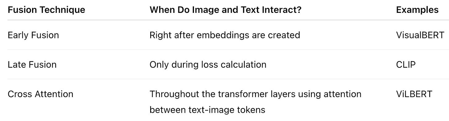 Late Fusion (used in CLIP): Image and text encoders work separately and are only compared at the loss level